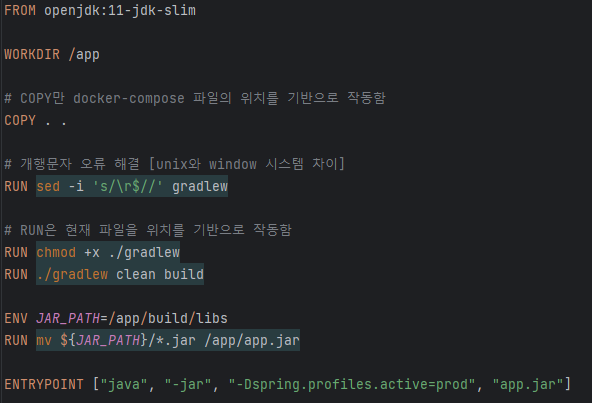 - WORKDIR: 컨테이너 내부에서 작업할 dir 설정