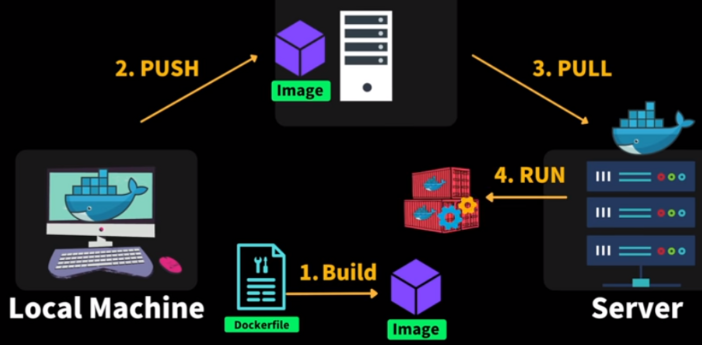 Dockerfile을 build하면 Image가 생성됩니다. 생성된 Image를 Docker-hub(images를 저장, 관리 및 공유 기능을 제공하는 registry)와 같은 곳에 Push합니다. 생성된 image를 필요한 Server에서 가져오고(Pull), 이를 실행하면 Container가 생성되는 구조입니다.