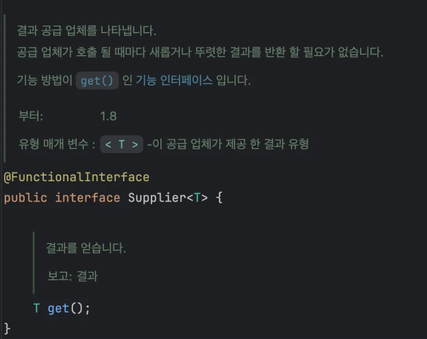 - T get(): 매개변수를 사용하지 않고, 리턴만 하는 함수 형태입니다.