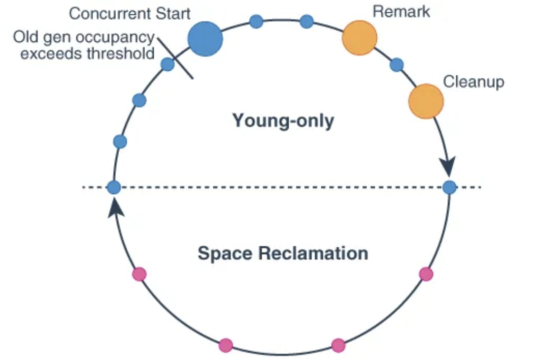 - Young Generation에서 Normal Young Collection이 반복적으로 수행되며, 이 과정에서 Young Generation에서 Old Generation으로 객체가 승격됩니다. Old Generation의 점유율이 Initiating Heap Occupancy 값에 도달하면, Young-only Phase에서 Space-reclamation Phase로 전환 준비를 시작합니다.
