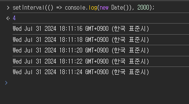 - ex) setInterval(() => console.log(new Date()), 2000)