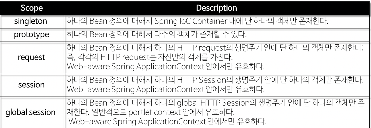 이 중에 request, session, globalsession은 Spring Mvc Web Application에서만 적용된다.