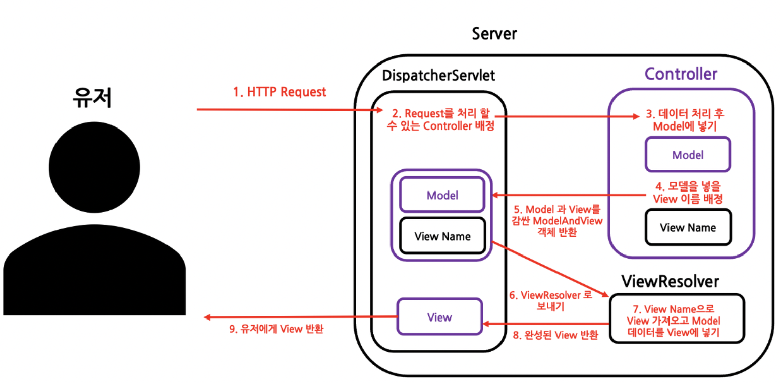 - Data를 통해 얻은 Model 정보를 Controller에게 response 해주면, Controller는 이를 받아 Model을 완성해 Model과 View를 감싼 ModelandView 객체를 Dispatcher Servlet에게 반환시켜준다.
