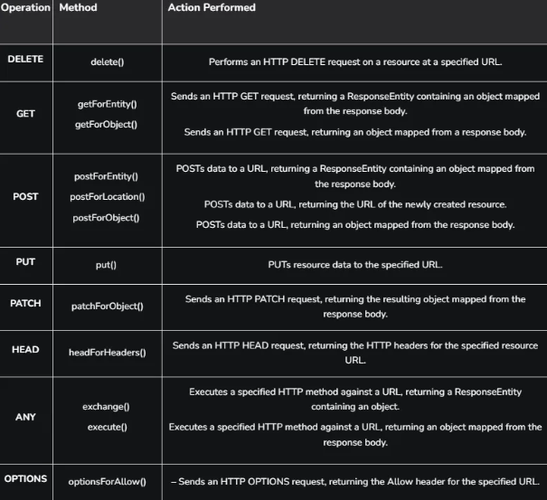 HTTP의 요청과 응답에 대한 메서드라고 생각하시면 될 것 같습니다. 그중에서도 exchange(), execute() 메서드는 ANY 옵션으로 어떤 HTTP 메서드가 들어와도 상관이 없습니다.