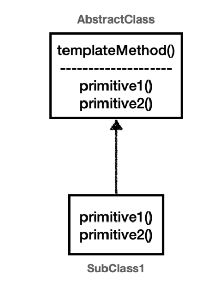 부모 클래스에서의 템플릿을 정의하고, 일부 변경되는 로직을 자식 클래스에 정의하는 것입니다. 쉽게 설명드리면 templateMethod()는 변하지 않는 메서드(핵심 기능)이고, primitive1(), primitive2()는 변하는 메서드(부가 기능)입니다. 이들을 분리할 수 있다는 장점이 있지만, 부모 클래스에 강하게 의존한다는 단점도 존재합니다. 코드로 설명드리겠습니다.