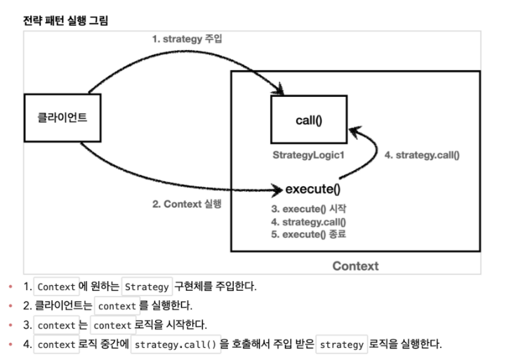 이는 인터페이스에만 의존하고 스프링 DI에서 사용하는 방식입니다. 전략 패턴은 변하지 않는 부분을 Context라는 곳에 두고, 변하는 부분을 Strategy라는 인터페이스를 만들고 해당 인터페이스를 구현해서 문제를 해결합니다. 템플릿 메서드 패턴과 달리 상속이 아닌 위임으로 좋은 설계를 할 수 있게 됩니다.